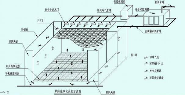 氣流→初效凈化→加濕段→加熱段→表冷段→中效凈化→風(fēng)機(jī)送風(fēng)→管道→高效凈化風(fēng)口→吹入房間→帶走塵埃細(xì)菌等顆粒 → 回風(fēng)百葉窗→初效凈化 重復(fù)以上過程,即可達(dá)到凈化目的。